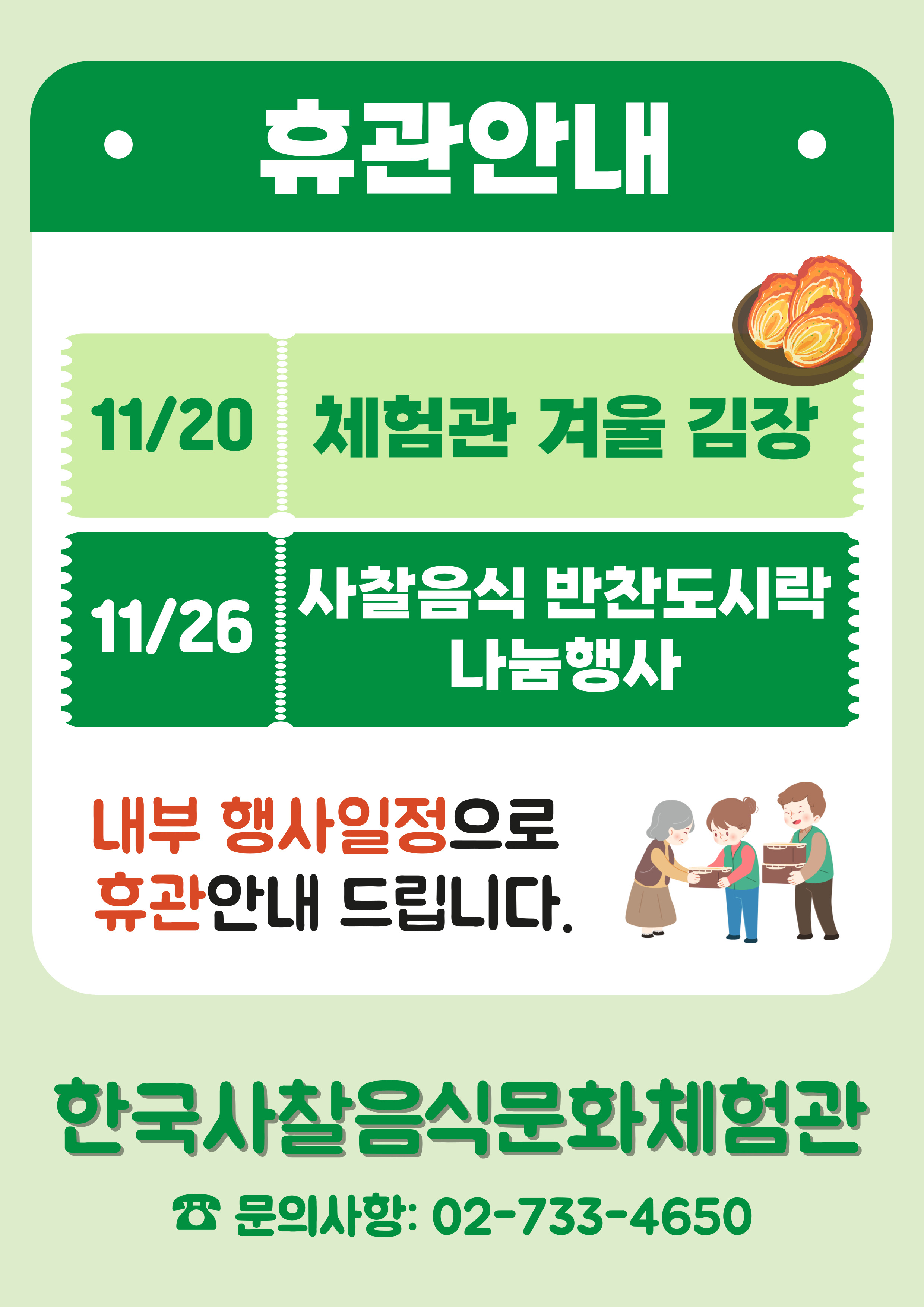 11월15일(토) / ★특별체험★ 겨울맞이 사찰 김치 지견스님 / 14:00 ~ 17:00_고추씨 백김치, 가을 석박지, 사찰식돌산갓물김치(오후)