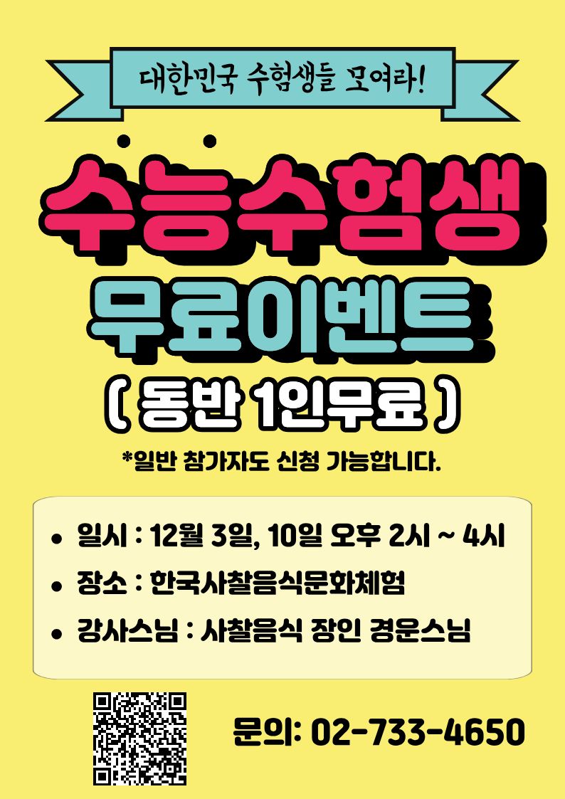 사찰음식 전문가 인력풀(Pool) 모집 대한불교조계종 한국불교문화사업단에서는 사찰음식 전문조리사 자격증을 보유한 스님 및 일반인을 대상으로 "사찰음식 전문가 인력풀(POOL)"을 모집합니다. 선발된 분들은 향후 한국불교문화사업단 및 전국 사찰에서 진행하는 사찰음식 관련 행사와 교육 등에 강사, 보조강사, 조교 등으로 참여하게 됩니다. 관심 있는 분들께서는 아래 내용을 확인하신 후, 첨부된 지원서를 작성하여 기한 내에 접수해 주시기 바랍니다. 많은 분들의 적극적인 참여를 바랍니다. □ 모집 분야 : 사찰음식 전문가 ※ 한국불교문화사업단에서 시행한 사찰음식 전문조리사 시험 합격자에 한함 ※ 스님은 사찰음식 전문강사 양성 교육을 수료하셔야 신청 가능함 □ 접수 기간 : 2025년 8월 20일(수) ~ 9월 12일(금) 접수기간 에만 서류제출 가능!!! 미리보내거나 늦을시 접수제외됨! ※ 접수기한 내 제출서류 미비(누락, 식별 불가)시 별도 추가(보충) 서류를 재요청하지 않으며 대상자 선정에서 제외 □ 지원 자격(필수) 1. 한국불교문화사업단에서 발급한 사찰음식 전문조리사 시험 합격자(스님, 일반인) ※ 스님이 신청하실 경우 첨부파일 1, 2를 같이 제출하셔야 합니다. ※ 일반인들은 첨부파일 1을 제출하시되, 작성해야 하는 경력이 많은 경우 칸을 추가하여 작성해주시기 바랍니다. 2. 요리 관련(조리사, 강사 등) 7년 이상 재직(증빙 서류 제출) / 일반인 ※ 증빙서류 - 4대 보험 납입이 확인이 또는 기관(구청이나 학교 등) 경력증명서 발급이 되는 경력만 인정. 단, 사찰에서 근무한 경우 사찰 주지스님 직인이 있는 경우 가능 / 일반인 - 경력 증빙 시 일주일에 최소 3회이상(하루 3시간 이상) 강의한 경우에만 인정됨 3. 사찰음식 전문강사 양성 교육 수료자 / 스님 □ 수행 역할 : 2026년 이후 전국 템플스테이 및 사찰음식 특화사찰, 홍보행사 사찰, 외부 기관에서 사찰음식 프로그램 운영 및 보조 예정 □ 사업 내용 1. 사찰음식 자격증 취득자 대상 사찰음식 전문인력풀 구성 2. 사찰음식(한국불교문화사업단) 홈페이지를(예정) 통해 인력풀(개인 정보 제외) 공유 □ 제출 서류 1. 신청서(개인정보 이용 동의서 포함) 1부 2. 경력증명서 및 해당 분야 자격증 사본 등 전문인력 증빙자료(한글 파일에 첨부) □ 선발 방법 : 서류 심사 1. 서류심사 결과 통보 : 2025년 10월 24일(금) 13:00 이후 개별 통보 □ 신청 방법 : 사찰음식 홈페이지(https://www.koreatemplefood.com) 에서 신청서를 다운 받아 이메일 접수(csy0109@templestay.com) ※ 개별 방문 접수는 받지 않음 ※ 반드시 한글파일로 접수해야 함 ※ 사진 또는 pdf, 자필로 작성한 파일을 제출한 경우 심사대상에서 제외 됨 ※ 작성칸이 부족할 경우 칸을 추가하여 작성 ※ 증빙서류는 한글 파일 뒤에 첨부해야 하며, 개별 제출 금지 ※ 제출 양식에 맞지 않으면 서류 접수 되지 않음 □ 제외대상 ※ 타 기관 사찰음식 자격증 소지자 ※ 사찰음식 교육 수료자 □ 접수된 서류는 반환하지 않음 □ 제출된 서류 등에 허위 기재 또는 기재 착오, 구비 서류 미제출 등으로 인한 불이익은 제출자 본인에게 있음 □ 문의처 : 한국불교문화사업단 사찰음식팀(☎ 02-2031-2051)